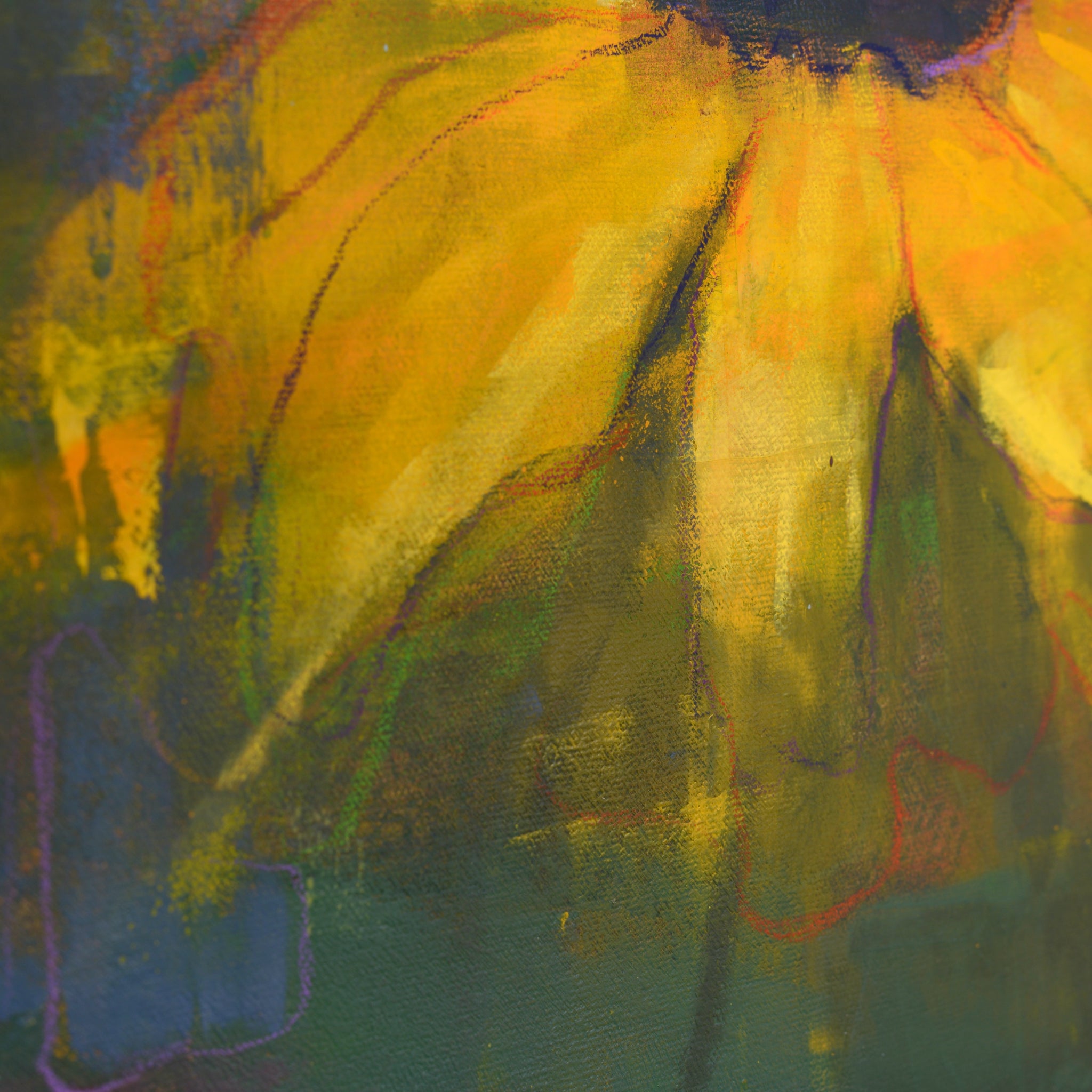 “Guardians in Gold” brings the black-eyed Susan to life in larger-than-life scale, its blossoms rising from darkness like sentinels of resilience. The rhythmic patterns of bold strokes, spray paint, and crayon pulse across the canvas, echoing the heartbeat of the natural world.