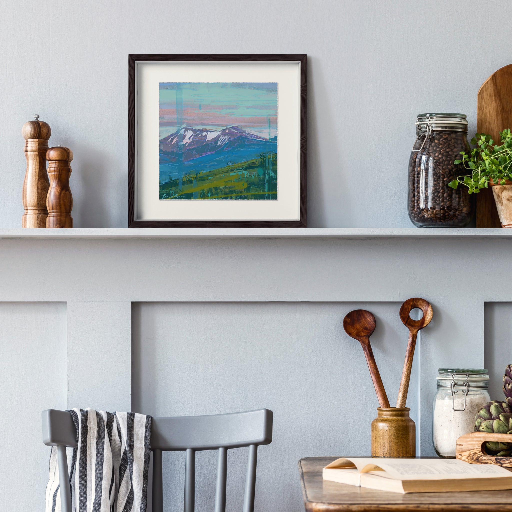 Meaningful art brings a sense of joy and belonging to any room. Surrounding yourself with art enhances your daily experience—and “Mountain Silence” offers that quiet presence. This small painting captures nature’s hidden energy: a moment when time seems to stop, and something wonderful touches the soul. Cool tones flow through layered foothills and snow-dappled peaks, creating space to breathe and just be.